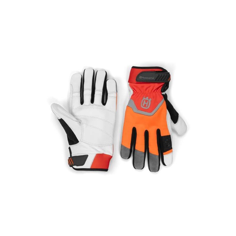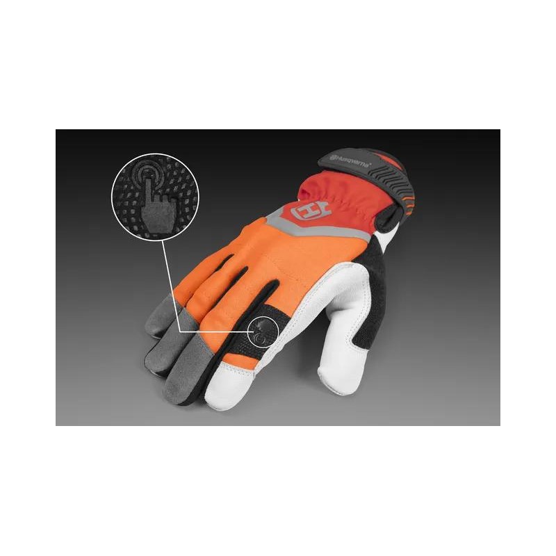 Wygodne rękawice ochronne przeznaczone do pracy pilarką łańcuchową. Spód wykonany z wytrzymałej, naturalnie wodoodpornej skóry koziej z podwójną powłoką. Podwójne szwy na kciuku dopasowują się do kształtu dłoni.